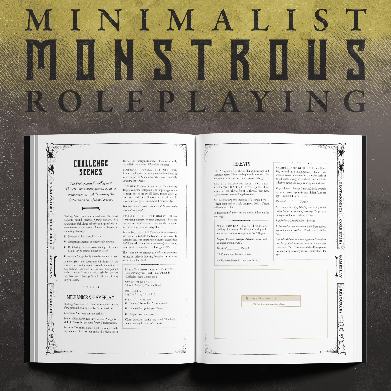 To everyone who’s been patiently waiting for Playtest 4: thank you. I promise, the work continues (even if I’m writing at a “Half-Life 3 confirmed” pace). The full release Playtest 4 release is getting so close and will include full rules for running the game’s six Scene types – everything a Storyteller needs to run a game of Minimalist Monstrous Roleplaying for themselves.