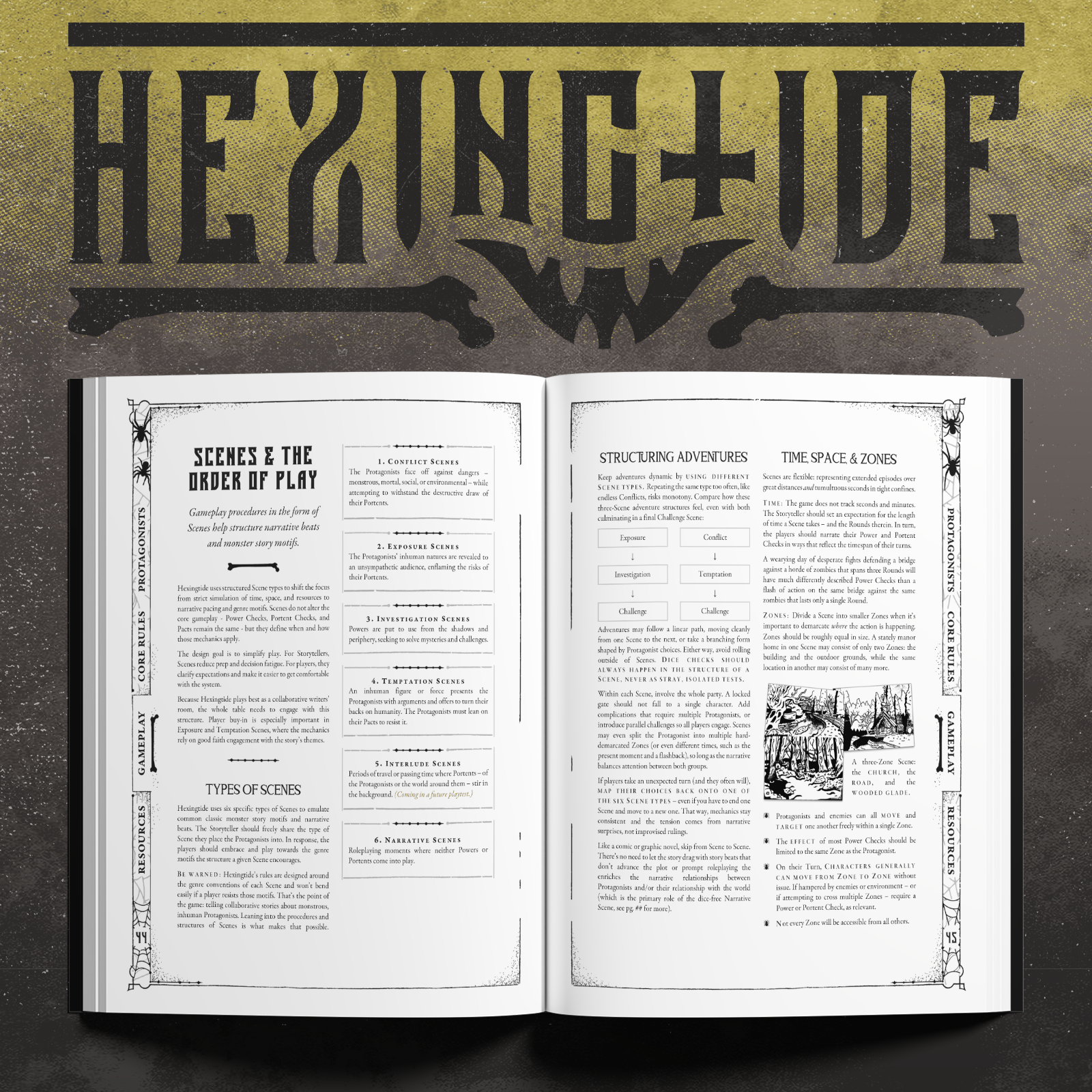 Trophy inspired me to embrace a procedure-focused gameplay loop that uses structured Scene types to reinforce theme and tone. Hexingtide‘s six Scene types (Challenge, Investigation, Exposure, Temptation, Interlude, and the RP-focused Narrative) use clear player and Storyteller procedures that align the fiction with the mechanics.